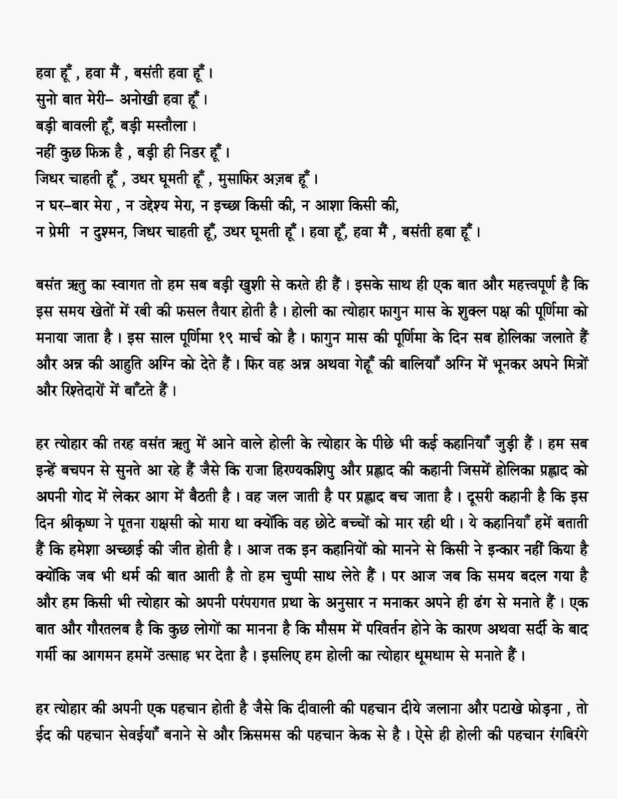 यह निम्नलिखित सामग्री मैंने कई संसाधनों से एकत्र की और यहाँ आपके सब के साथ बाँट रही हूं। इस सामग्री का प्रयोग मैंने स्कूल में एसेंबली में किया ताकि बच्चों को होली के बारे में विस्तृत जानकारी मिले और वे हिंदी साहित्य का भी लुत्फ़ उठा सकें । बच्चों ने ही इस सामग्री को एसेंबली में सबके सामने प्रस्तुत किया और फिर होली का त्यौहार हम सब ने मिल -जुलकर मनाया । आशा है कि आप भी इस सामग्री का प्रयोग बच्चों के साथ कर पाएंगे ।